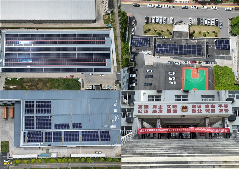 該項(xiàng)目包含宣州區(qū)貍橋鎮(zhèn)政府0.03MW、安徽颯拓新材料科技有限公司0.8MW、宣城舜泰機(jī)械制造有限公司0.6MW 三處分布式光伏電站,總?cè)萘繛?.43MW,項(xiàng)目成功并網(wǎng)后年均發(fā)電量約為157.92萬(wàn)千瓦·時(shí),綠色電能得到高效利用,園區(qū)企業(yè)在正常生產(chǎn)的同時(shí)享受到實(shí)實(shí)在在的綠色紅利,并進(jìn)一步助推區(qū)域環(huán)境、經(jīng)濟(jì)及社會(huì)效益有效提升。